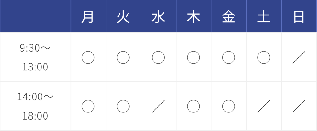 | 14:00〜18:00 | ◯ | ◯ | / | ◯ | ◯ | / | / |